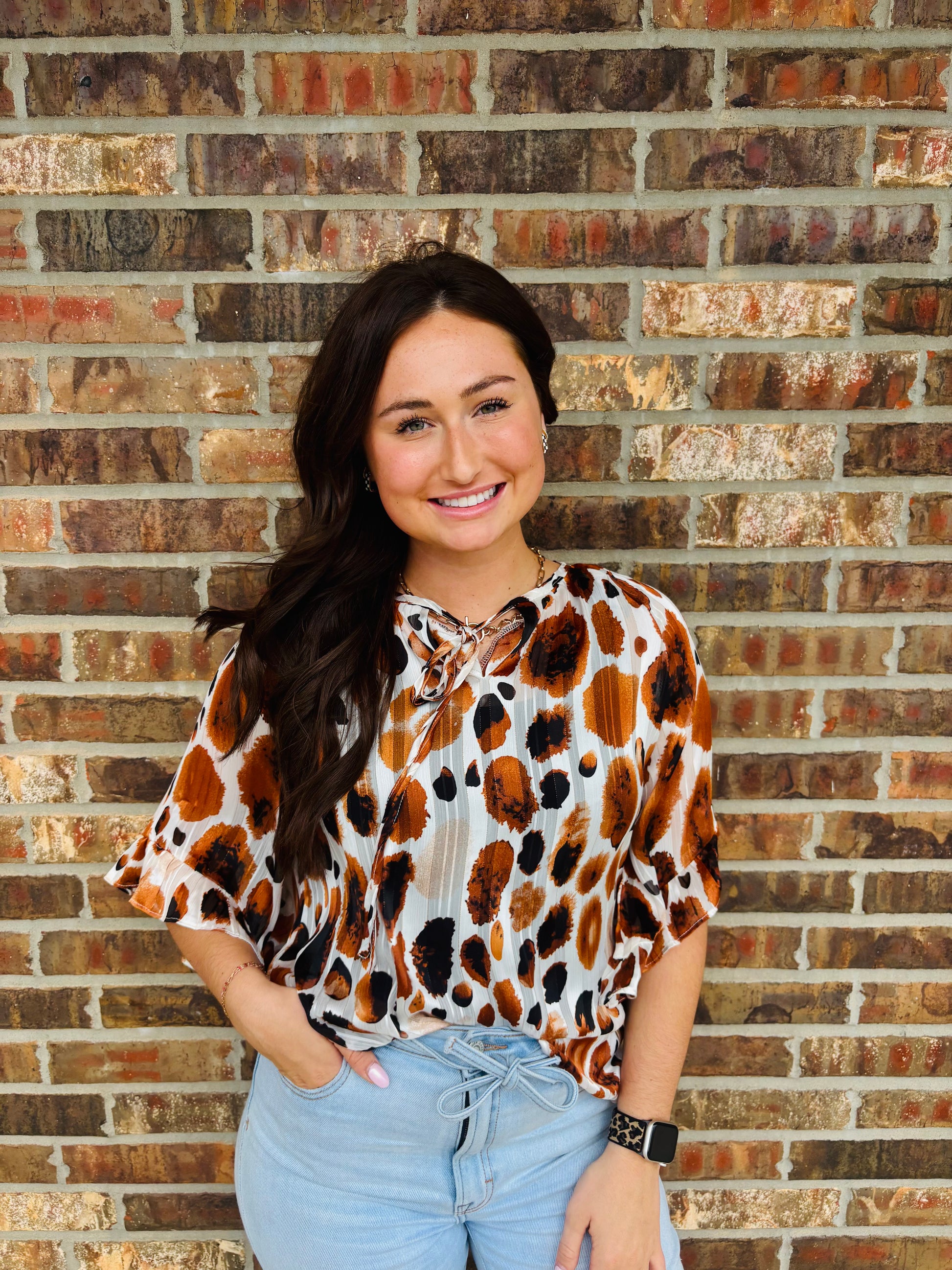 Add a spark of fun to your wardrobe with the Caroline Metallic Top. Featuring playful brown metallic threading woven into an abstract pleated design, this top catches the light with every move. Its unique texture and shimmer make it perfect for turning everyday outings into stylish adventures.