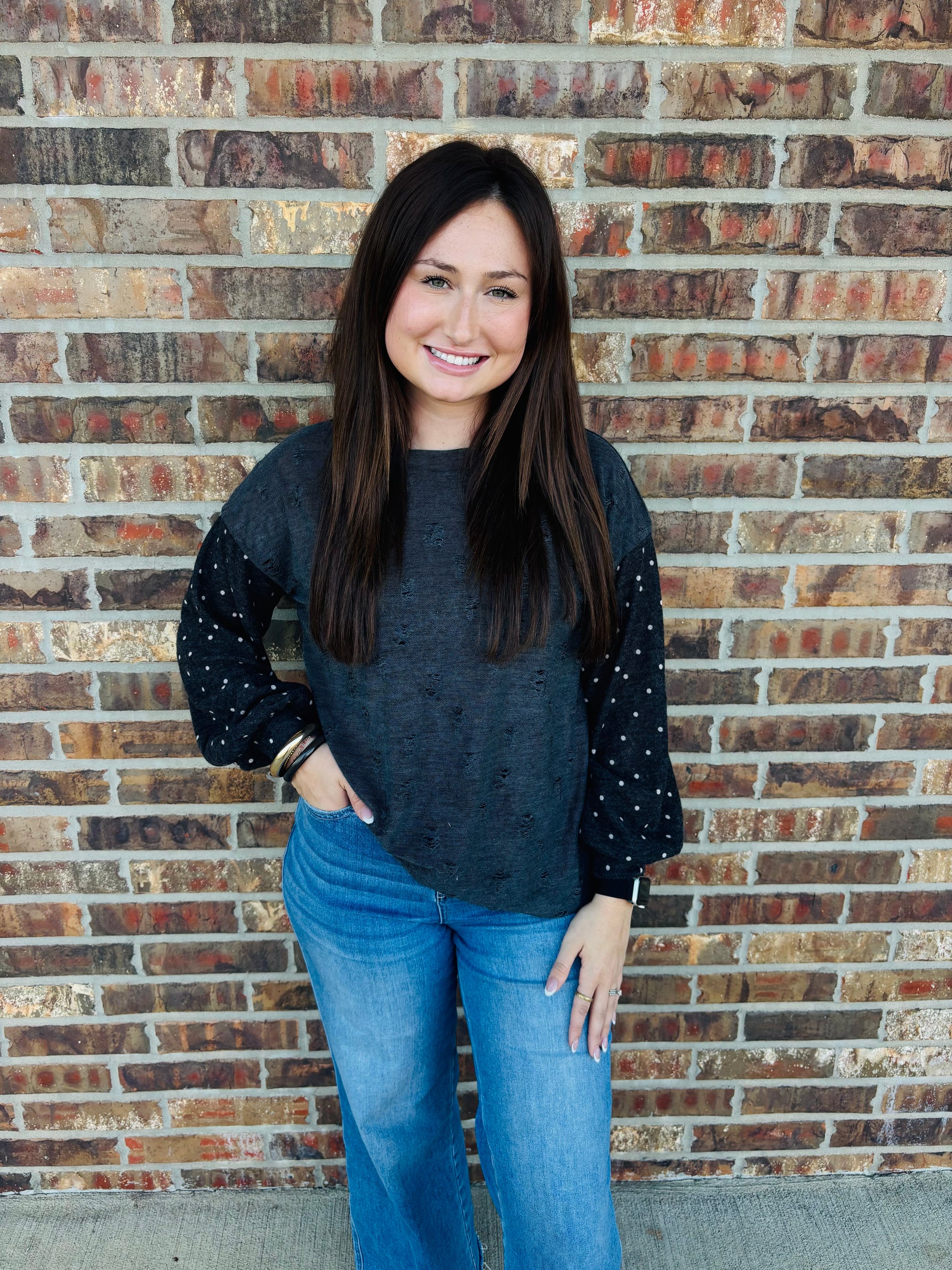 Elevate your casual wardrobe with this distressed knit long sleeve top featuring charming polka dot sleeves in a versatile charcoal hue. The subtle distressed details add an edgy touch, while the playful polka dots bring a unique contrast to the soft knit fabric. Perfect for layering or wearing on its own, this top offers both comfort and style for everyday wear.
