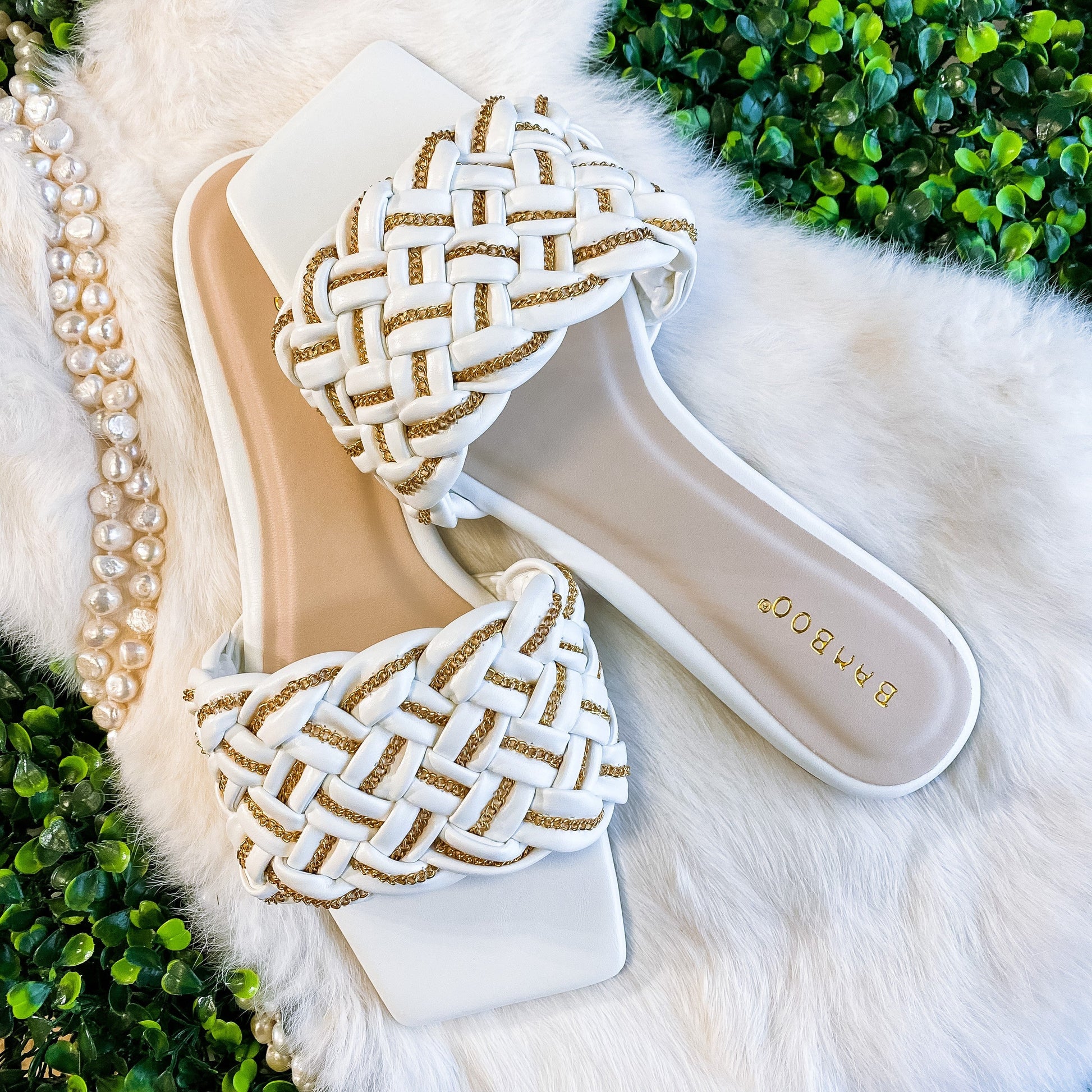 These flat sandals have a wide band with an upper braided chain detail! The cutest sandals that perfect for the spring and summer!