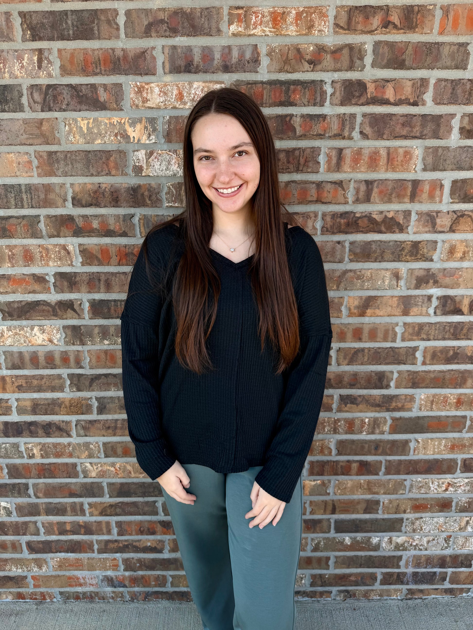 Stay cozy and stylish in the Grayson Thermal V-Neck Top. Crafted from black waffle-knit fabric, this long-sleeve thermal offers warmth without bulk, while subtle stitching details add a touch of refined texture. Perfect for layering or wearing alone, it combines comfort and casual elegance for everyday wear.