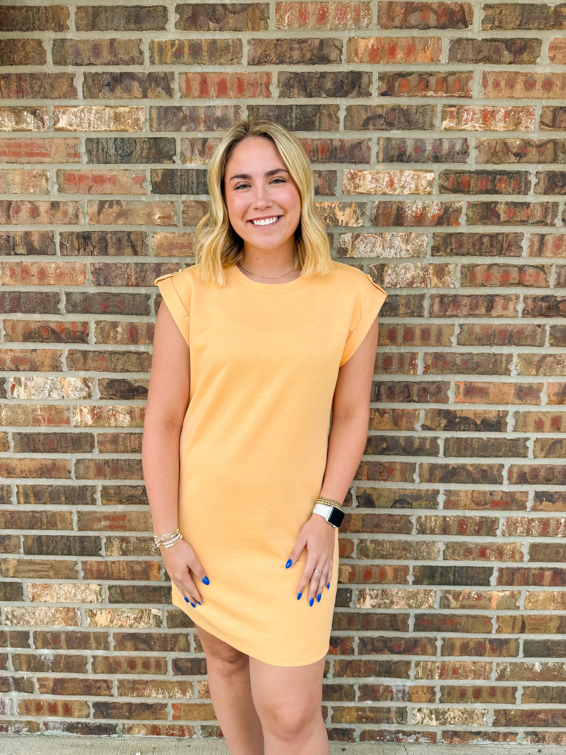 The Jocelyn Cap Sleeve Dress features charming button details and a flattering cap sleeve design. Crafted from soft, smooth scuba material, it offers a comfortable fit with a sleek silhouette. Perfect for adding a playful touch to your wardrobe, this dress moves with you while keeping you stylish all day long. True to size fit.