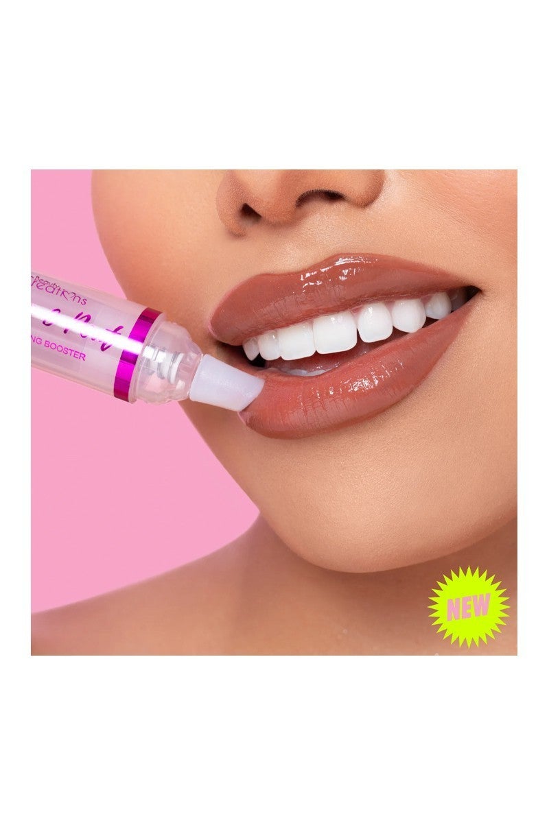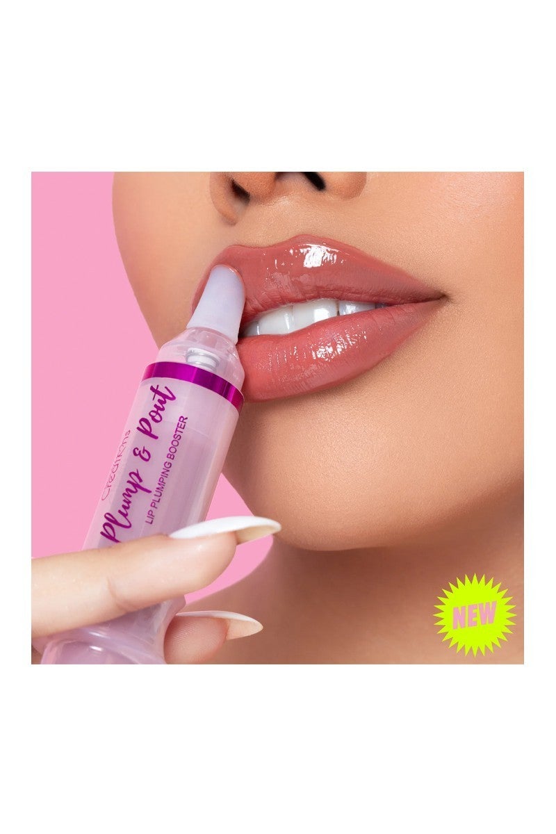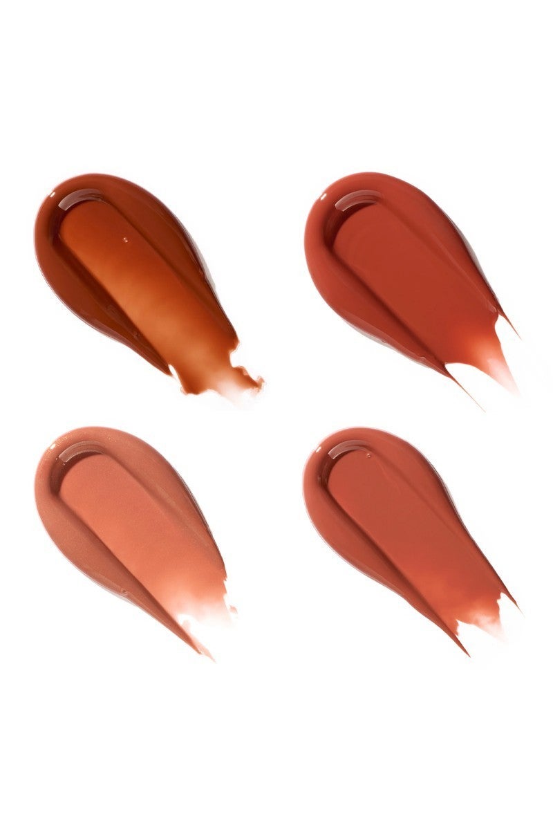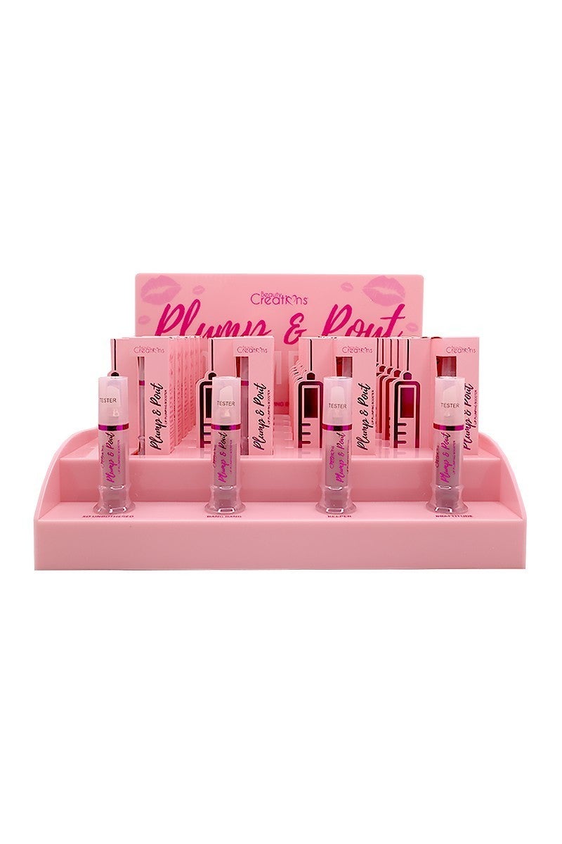 Beauty Creations Plump and Pout. Formula that instantly plumps and gives lips a fuller effect. Display includes 4 different shades. Keeper a warm spice glossy tint. So Unbothered a pearl nude glossy tint. Bang Bang a hazel nut glossy tint, and Brattitude a mocha brown glossy tint