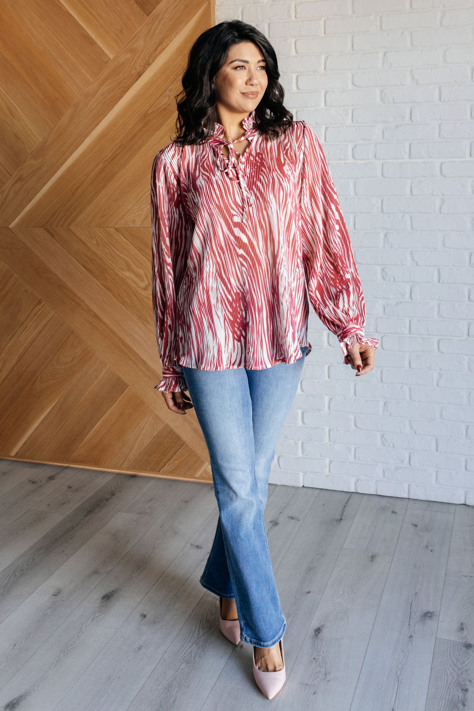 Take a walk on the wild side in our Wild Journey Animal Print Blouse. Made from luxurious poly satin, this blouse features a chic V-neckline and a functional neck tie for a touch of elegance. The playful poet sleeves and frill details add a touch of whimsy to this plisse blouse.