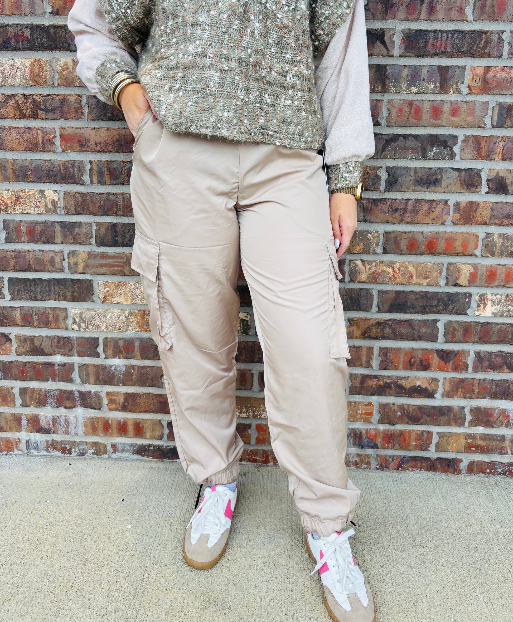 YMI's nylon cargo pants deliver utilitarian style with a functional design. Crafted from durable nylon fabric, these jogger-inspired pants feature a stretchy waistband for comfortable wear while maintaining structure throughout the legs. Multiple cargo pockets provide practical storage for everyday essentials. The minimal stretch in the body creates a tailored silhouette that holds its shape, making these pants ideal for those seeking a polished, put-together look with genuine utility.